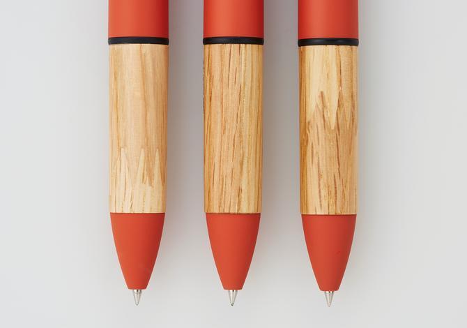 家具製造時に生じる端材をグリップに再利用した個性的なジェットストリーム多機能ペン。